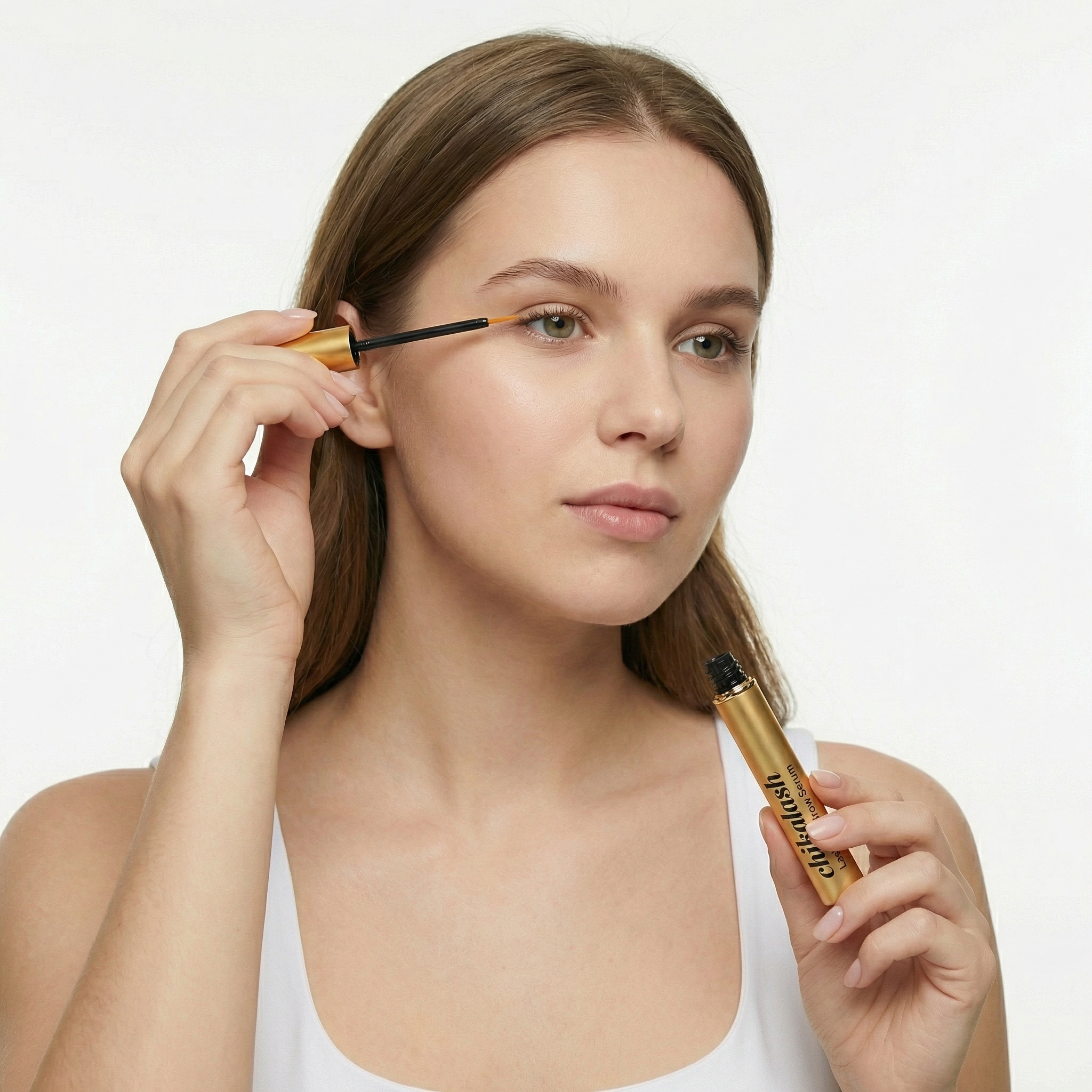 Наносите сыворотку легким, уверенным движением вдоль линии роста ресниц и на брови.